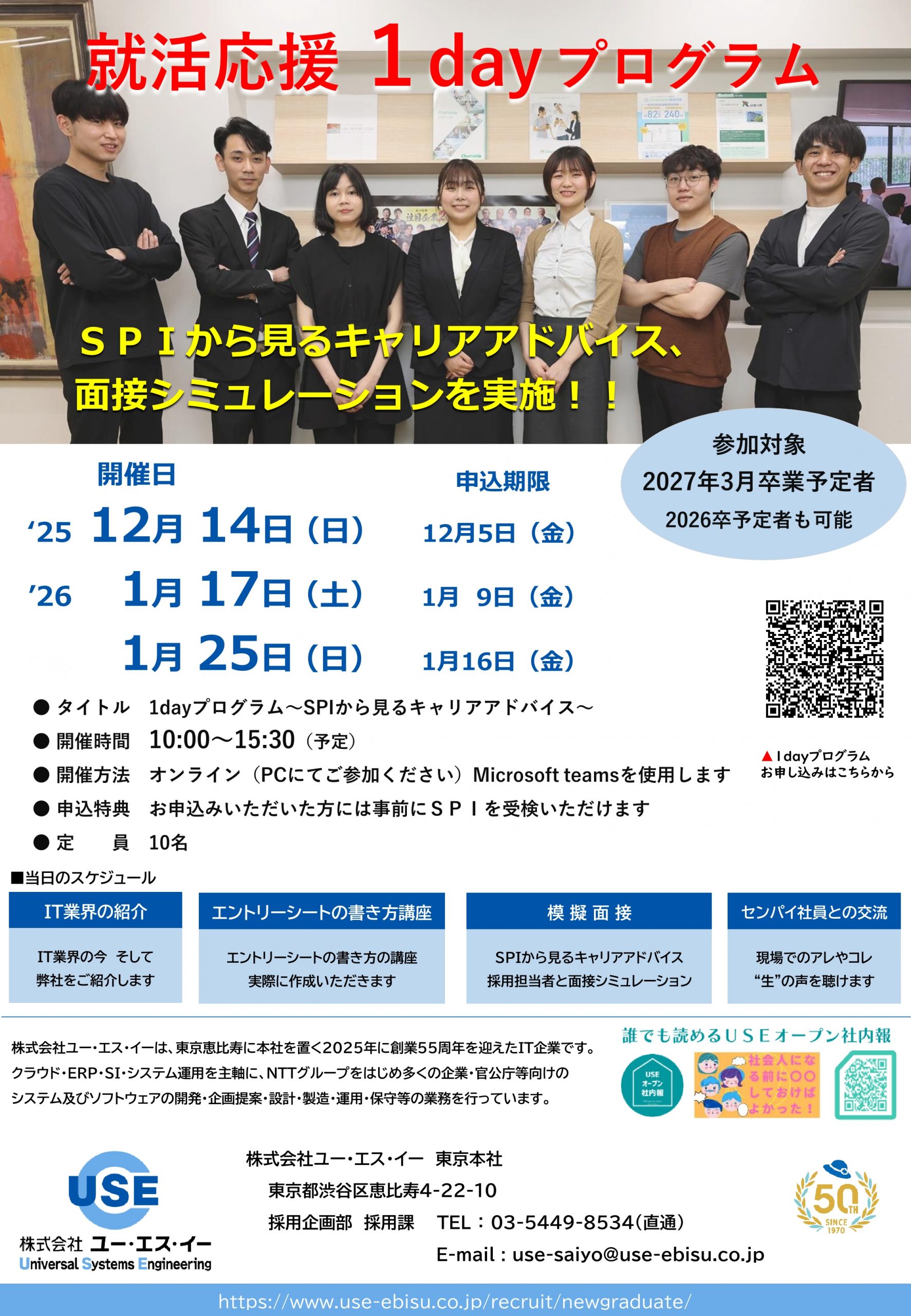 | 【26/3卒】●株式会社ユー・エス・イー 11月開催「web説明会のご案内」 11月開催「就活応援 1dayプログラムのご案内」 (会社概要)(募集要項) |